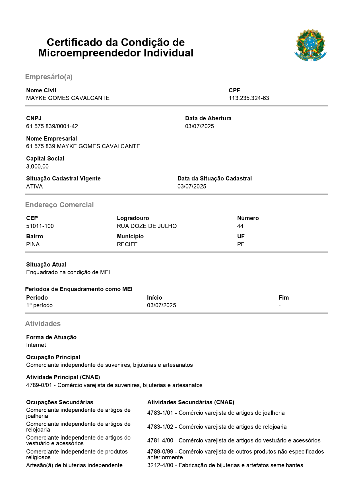 Razão Social: 61.575.839 MAYKE GOMES CAVALCANTE